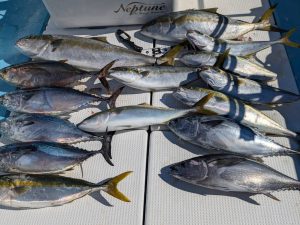 ジギング 10月12日釣果 10月12日ジギングで出船。 今日は時化明けでウネリも残り風もそこそこありましたが、コシナガマグロやスマ等の小型ツナ系はよく当たりました! ヒラマサもぼちぼち出てきてますね。 小ビラも混じりますが、10kgオーバーも釣れてます。 釣って楽しい食べて美味しいコシナガ&スマカツオ、人気です! 関連釣果投稿 6月22日 SLJ ひさびさの釣行